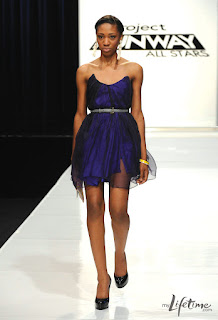 His gelato was some berry flavored concoction. His garment was typical of his style...very easy, very bohemian. I loved the prints he used this week and the strapping gave it a nice pop, but I think we all know by now that Jerell isn't in the running to win the All-Star competition. He was safe...much to Miranda Kerr's relief.